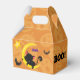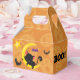 Here are cute kids Halloween favour treat boxes that have just the right amount of "spook" to them! The front features an adorable image of a black kitten riding on a yellow crescent moon, with black bats hovering about. The back of the box has an image of the kitten in a jack o' lantern, with a few more bats flying about. The stylised text on the side says BOO, and Happy Halloween with your custom text on the other side. The background is a orange jack o lantern pattern. Cute, and not scary. *Graphic design credit to Prettygrafik.com.