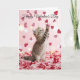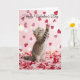 A cute tabby kitten catches heart-shaped, pink and red flower petals that are falling from the sky just in time for Valentine’s Day.