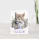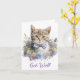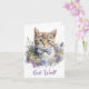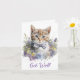 Cute custom get well greeting card, with watercolor artwork of a cute tabby kitten, with a bow tie, sitting in a bed or wildflowers. Personalise the text to read what you want.