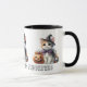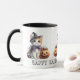 Meow! Add Whimsical Charm to your Festive Holiday Table with this Cute Cat Halloween Mug! The Artwork features a Cute Cat wearing a Halloween Costume. Clad in a Witches Hat, Bat Wings, and a Bow Tie this Kitty is sitting pretty next to its Jack-o-lantern that is full of Goodies. The verse says, "Happy Halloween Jennifer!" Personalise this Kitty Mug by adding your Loved Ones Name, or add your own phrase.