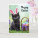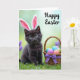 This card shows a small dark-furred kitten sitting on fresh green grass, wearing oversized pink-and-white bunny ears 🐰. Its bright green eyes glance slightly upward, giving it a tender, curious look that feels like it’s waiting for a friendly nuzzle. To the right, a rustic woven basket rests close by, suggesting the kitten has wandered over to keep it company. The basket is filled with smooth pastel eggs in lilac, turquoise, soft orange, and bright green, adding gentle color against the darker fur. A purple ribbon wraps around the basket and ties into a neat bow, like a quiet gift between close friends 🌷. The background fades into soft greens with faint lavender touches, keeping the focus on the kitten and the basket. In the upper right, the words “Happy Easter” appear in black, with the letters floating above the scene.