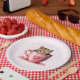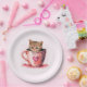 Paper plates with a cute little kitten. Sitting in a teacup looking positively adorable. One little paw hangs on the brim. Hearts swirl all around. Sweet and whimsical.