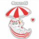 Cute kitten in red and white hammock. Text can be personalised. Great to keep in mind vacations, hollidays and retirement!