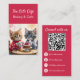 A vertical business card with a cute design with two kittens drinking a hot drink and eating cake. The background is red with your text in white. On the back a customisable QR code and social icons to let your customers connect with you online.