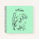 A fun colourful back to school square spiral notebook featuring an original line drawing cartoon of an adorable kitty! Bright green background.