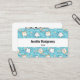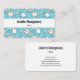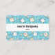 Business cards with a cute cat pattern, set on a blue background and decorated with rainbows and paw prints and more.