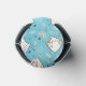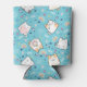 Can cooler with a cute cat pattern, set on a blue background and decorated with rainbows and paw prints and more.