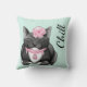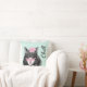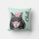 Cute light mint green throw pillow with watercolor artwork of a sleepy smiling tuxedo cat wearing pink jewels and a flower. Black text reads Chill. Great gift idea for any cat lover.