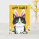 This greeting card features a stylised black-and-white tuxedo cat centred on a rich marigold-yellow background, looking straight ahead with wide green eyes that feel like an inviting glance between friends. Tall bunny-like ears sit on its head, with soft pink inner details that add a gentle, affectionate touch 🐰. A small rosy nose and a simple curved mouth give the cat a calm, sweet expression, like it’s quietly sharing a warm hello. Across the top, a seasonal greeting appears in dark lettering, placed high and easy to read against the yellow. Along the bottom edge, a row of white, daisy-like flowers with yellow centres stretches across, with thin green stems that lightly frame the scene 🌷. The strong contrast between the cat’s dark patches and the bright background makes the character stand out without any extra clutter. The lower border shows clustered white petals and sunny yellow centres, with slender green stems rising just above the bottom margin.