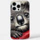 This artwork showcases a charming koala bear with big eyes and fluffy fur. The koala is playfully clinging to a bright red object, adding contrast to its soft colours. It captures the essence of this beloved Australian marsupial in a playful style.