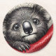 This artwork showcases a charming koala bear with big eyes and fluffy fur. The koala is playfully clinging to a bright red object, adding contrast to its soft colours. It captures the essence of this beloved Australian marsupial in a playful style.