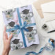 Wrapping paper with an illustration of a cute grey koala eating some eucalyptus leaves, wearing a fancy black graduation cap. Set on a light purple digital watercolor background.