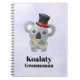 A sprial notebook with a cute koala bear in a black top hat with a red ribbon. Fancy and furry. Text says Koalaty Groomsman. Funny pun. Set on a light purple background.
