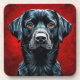 Striking illustration of a black labrador dog, depicted in a bold and stylised manner. The dog has a prominent, expressive face with bright orange eyes that convey a sense of intensity. The background is a vivid red, contrasting sharply with the dog's glossy black fur, which is detailed with an array of shades that highlight its texture. The overall composition gives the piece a dynamic and powerful presence, emphasising the dog's features and creating an engaging visual impact.