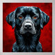 Striking illustration of a black labrador dog, depicted in a bold and stylised manner. The dog has a prominent, expressive face with bright orange eyes that convey a sense of intensity. The background is a vivid red, contrasting sharply with the dog's glossy black fur, which is detailed with an array of shades that highlight its texture. The overall composition gives the piece a dynamic and powerful presence, emphasising the dog's features and creating an engaging visual impact.