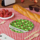 Cute and trendy pattern featuring hand drawn cartoon of ladybugs and daisies on a green background.