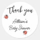 Cute Baby Shower Classic Round Sticker featuring red ladybugs in watercolor. It’s very easy to customise, with your personal details.