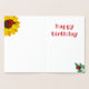 Gold foil birthday card in white ladybugs sitting on sunflowers and green leaves. Personalise the birthday card with the age of the birthday girl. Inside the card there are two more ladybugs with a sunflower and a green branch of leaves, along with "happy birthday" written in ladybug red.
