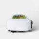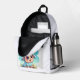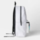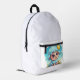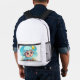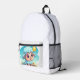 A clean, white backpack with a front pocket featuring a charming illustration of a cute cartoon lamb. The lamb has soft, fluffy blue wool and large, glistening purple eyes. It sits in a vibrant, sunlit field with yellow flowers and a bright yellow sun peeking from the top right. The overall design is whimsical and perfect for children, blending a practical item with a delightful, kid-friendly character design