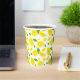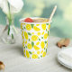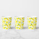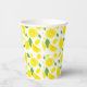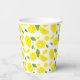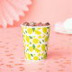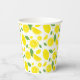 Lemon paper cups with a food pattern of smiling lemons and green leaves on a white background. These cute cups with their citrus fruit pattern will add to the fun of your event.