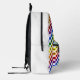 This awesome backpack features a rainbow coloured graphic design image of a bee. The bee has a yellow body with black eyes, legs and antennae and 5 stripes on its belly, one each in red, orange, green, blue and purple. There is rainbow coloured text around the bee that says "Bee proud Bee who you are"