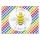 This awesome tablecloth features a rainbow coloured graphic design image of a bee. The bee has a yellow body with black eyes, legs and antennae and 5 stripes on its belly, one each in red, orange, green, blue and purple. There is rainbow coloured text around the bee that says "Bee proud Bee who you are"