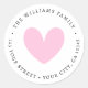Personalised round return address label featuring a cute, light pink heart at the centre, encircled by your name and address.