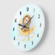 A clock with a cute watercolor illustration. An adorable lion wearing a crown fishing for stars sitting on a crescent moon resting on a fluffy cloud. Magical fantasy illustration. Light blue watercolor background.