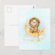 A postcard with a cute watercolor illustration. An adorable lion wearing a crown fishing for stars sitting on a crescent moon resting on a fluffy cloud. A bunch of faux gold foil stars beneath the fluffy cloud. Magical fantasy illustration.