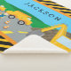 Got a little boy who loves construction vehicles? This sherpa blanket is perfect! The blanket has a dump truck, cement truck, and excavator, all working together at a road construction site. A young boy stands near the front with a stop sign to help stop traffic. There are also orange safety traffic cones and background mountains and blue sky. Finish the blanket with your young man's first name.