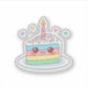 Centred print design featuring a kawaii flat illustration of a small rainbow cake slice on a plate. The cake has a smiling face with big eyes and rosy cheeks, topped with colourful sprinkles and a tiny candle.