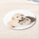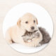 Cute little cat sleeps in dog's hands round paper coaster