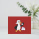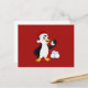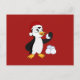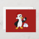 Postcard with an illustration of a cute little penguin with Santa’s hat and a snowball in his hands; Christmas holiday cartoon design for kids, on a red background