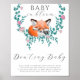 Baby in bloom Woodland Fox Floral Baby Shower. Personalise this woodland fox baby shower. Watercolor baby fox sleeping on floral and greenery leaves. Baby in Bloom.