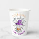 This delightful paper cup for a baby shower showcases an adorable little ghost wearing a purple witch hat, cheerfully displaying the word 'BOO.' The design is beautifully complemented by a backdrop of a spiderweb and playful bats, setting a festive and charming tone for the celebration of a new arrival. The blend of these elements not only introduces a hint of spookiness but also infuses the event with fun and joy, making it a perfect selection for any Halloween-themed baby shower.