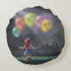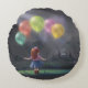 A cute little girl wearing a pink shirt and blue skirt stands holding five colourful balloons. She is bringing a patch of brightness to a dark world. In the distance is a grey building surrounded by mist and dark trees and mountains.