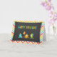 Happy Birthday card with cute little monster design and chalkboard and rainbow zigzag background.