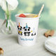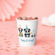 Three adorable little pandas in birthday hats sitting beside each other. One happy panda is wearing a tee shirt with "I heart panda" written on it. Another is offering a candy to a third panda that has fallen asleep.