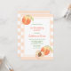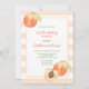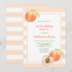 Kids birthday invitation features cute watercolor peaches on peach colour stripes background.