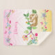 This is an original exclusive illustration, made by hand. This design has a soft pink and yellow background with lots of happy pink flowers and blue flowers. In the middle there is a very cute baby sloth hanging under a branch with tropical leaves. There is also a cute bird and a pink butterfly. You can add the name of the child on the blanket