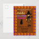 A sweet little children's Halloween costume party invite, this postcard can be completely customised to suit with names and dates etc. The design features a cute little girl dressed in a witch's costume for Halloween. She has her trusty sidekicks with her, namely her black cat and pet spider! They're all surrounded by a frame of grinning pumpkins on a purple glitter edging.