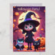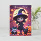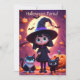 This invitation features a cute little witch in a black costume with cats and pumpkins on Halloween night.