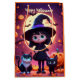 This gift bag features a cute little witch in a black costume with cats and pumpkins on Halloween night.