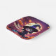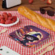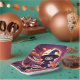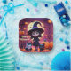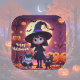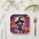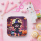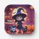 This paper plates features a cute little witch in a black costume with cats and pumpkins on Halloween night.