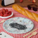 Birthday paper plates with a cute pattern featuring whimsical llamas. One is laying down, one is holding a flower in his mouth, and one is looking at you suspiciously. These animals have lots of charming character. Set on a green polka dot background. A fancy frame layered over top with your text inside.
