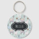 Personalised keychain with a cute pattern featuring whimsical llamas. One is laying down, one is holding a flower in his mouth, and one is looking at you suspiciously. These animals have lots of charming character. Set on a green polka dot background. Layered over top is a vintage fancy frame in black and white with your text inside.