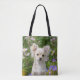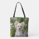 A young long-haired cream white coloured Chihuahua dog sitting in a flowering garden, photo taken by Katho Menden. This all-over printing shopping tote bag is a gift idea for dog lovers. http://www.zazzle.com/kathom_photo
