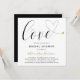 Typography Bridal Shower invitation featuring the word, "love" in black calligraphy with a gold heart swash at the end, over a white background. The name of the bride-to-be is in a matching shade of gold. The backside is solid black. The simple and minimal layout and lots of open space give this design a modern feel and the calligraphy lettering and hearts give it a romantic twist.
