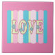 Cute design of the word Love in the bright pastel colours Honeysuckle pink, citrus yellow, soft blue with a striped background adds a sweet touch to any room. Accent tile can be a pretty addition to any tiled wall.