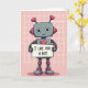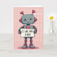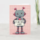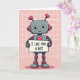 This cute pun greeting card features a cute grey robot standing front and center on a soft pink background with a faint grid pattern. The robot has big round eyes, a small smiling mouth, and coral-pink hearts on the tips of its two antennae and in a heart shape on its chest. It holds a creamy white rectangular sign with both hands, like it’s presenting a message just for you. The sign reads “I LIKE YOU A BOT” in hand-lettered, casual black writing, placed right in the middle of the card. The simple shading and clear outlines make the robot and the hearts stand out without feeling busy. Overall, it gives a sweet, friendly Valentine’s Day mood that works for romance or a kind note to a friend ❤️